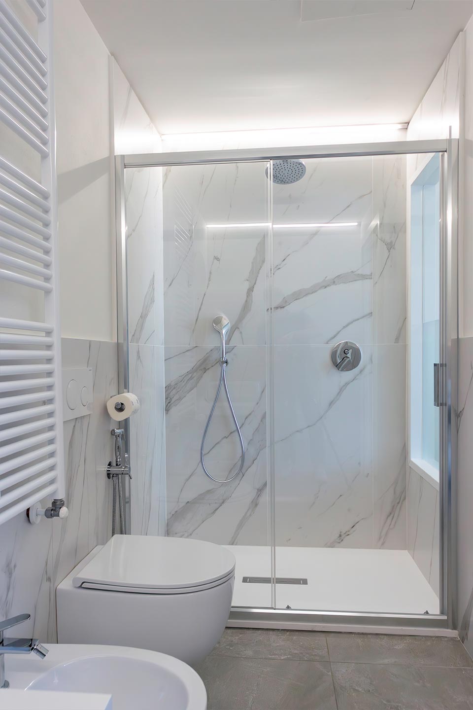 Bagno di fascia alta con finiture in gres e cabina doccia in vetro
